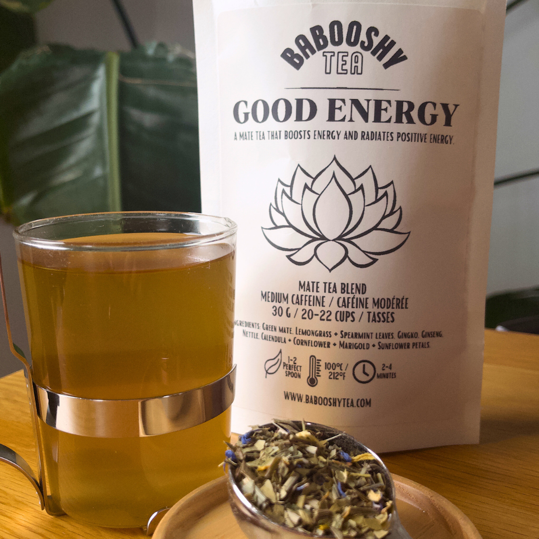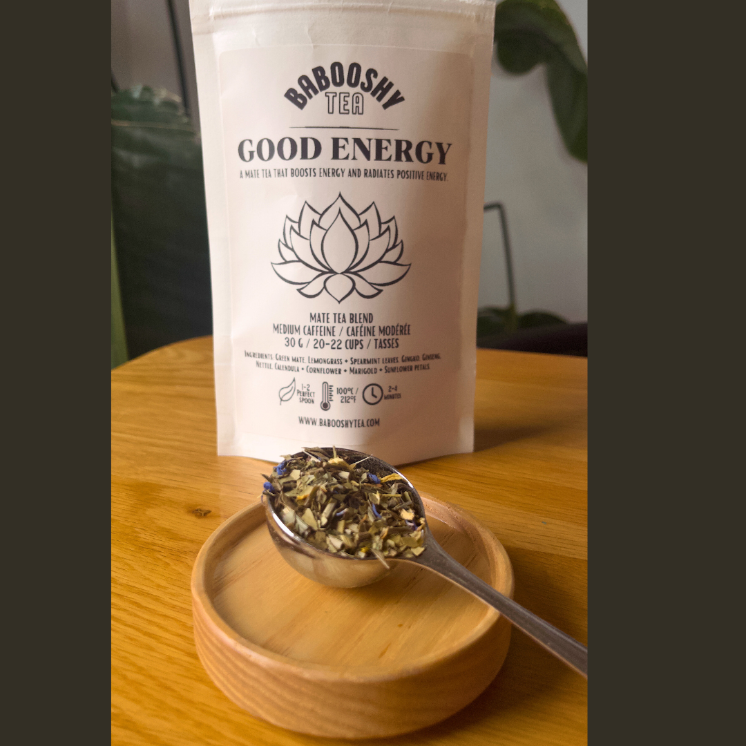 Enjoy the balanced boost of our "Good Energy" tea blend, infused with Yerba Mate. This blend is crafted for those seeking sustained energy without the jitters or crash associated with coffee. Ideal for professionals and health-conscious individuals, it's the perfect beverage to enhance focus and productivity throughout your day.